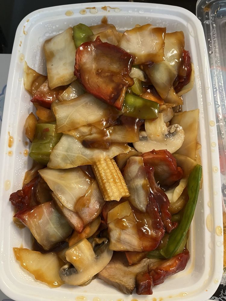 Roast pork, bok choy. Options: pint or quart size; choice of rice or lo mein (crabmeat, house, vegetable, chicken, beef, pork, shrimp, plain).